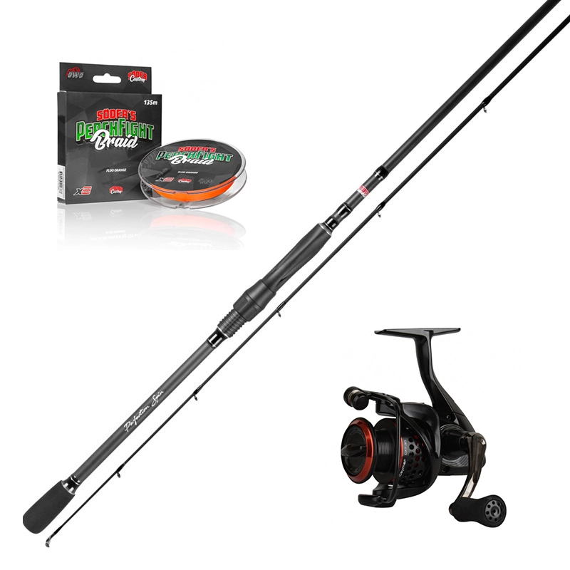 Rute – Söder Tackle Perfection SpinVores egen super flotte og prisvenlige stængerserie til aborrefiskeri. Emnet har en hurtig og sprød handling perfekt designet som en allround aborrestang. Fungerer godt med softbaits, håndsving og ryk. Denne stang vil også fungere perfekt til ethvert lettere fiskeri. Blandede moduler med lav harpiks avanceret kulstofblanding, AT-hjulssæde og guider.Söder Tackle Perfection Spin 7’6” 5-30g 2pc• Længde: 7’6”/228 cm• Kastevægt: 5-30 g• Model: Spinning• Vægt: 130 g• Længde baghåndtag: 31cmSöder Tackle Perfection Spin 7’6” 5-20g 2pc• Længde: 7’6”/228 cm• Kastevægt: 5-20g• Model: SpinningRulle – Okuma Ceymar XT CXT-25FD 7+1bb inkl. Alu reservespoleRiktigt fina rullar som klarar tuffa tag. Ceymarserien findes från det lätta abborrfisket til det tunga gäddfisket!Multi-disc, japansk bromsskiv-system7BB+1RB för maksimal mjukhet , 6BB+1RB på storlek 10Quick-Set rullager för backspärrPrecisionsskuret pinjondrev i bronsKorrosionsresistent grafitkroppRejält håndtag i anodiserat aluminiumLätta TPE-håndtag för ekstra komfortPrecision elliptisk gearsystemSpole i anodiserat aluminium Kraftfuld bygel i aluminiumRESII: Computerbalanceret rotorudligningssystemLinkontrollsystem på spolen för längre kastAluminiumhandtag med EVA-handtagExtraspole i aluminiumSpec 25:&bull ; Vikt 227g• Linkapacitet 295m/0,15mm• Kullager 7+1• Utväxling 5,0:1• Maxbroms 7kgLine – Söder PerchFight Braid X8 Fluo Orange 135m PerchFight Braid er stærk, slank og kraftfuld. Lavet af 8 tråde af høj kvalitet fletning denne linje vil få dig til at kaste længere, kæmpe hårdere og føle hver lille nip på din lokke! Dens følsomme egenskaber gør, at den leverer et rent støb og en stram fornemmelse. PerchFight fletningen er perfekt til let grej og jigging til aborre og sandart!• 0,12 mm har en brudstyrke på 8 kg• 0,14 mm har en brudstyrke på 9 kg